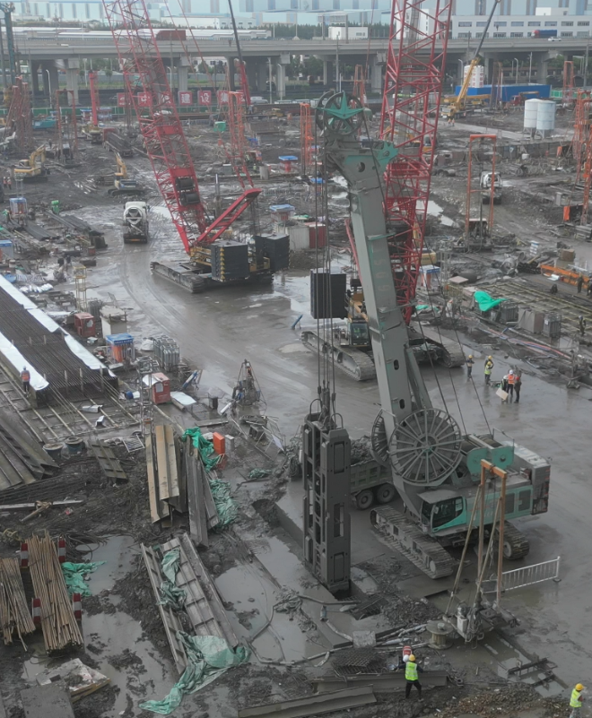 寶山高鐵站地下連續墻工程面臨多重施工挑戰:首先,近期上海持續高溫、臺風、強降雨等惡劣天氣情況,地表溫度超70℃,對工程人員體能、設備穩定性構成極大考驗;其次,工程需完成槽寬1.2m、槽深63m的超深地連墻施工,突破常規作業深度;第三,工期緊張,每幅槽作業時間嚴格控制在15-16小時,對設備性能與施工組織提出極高要求。